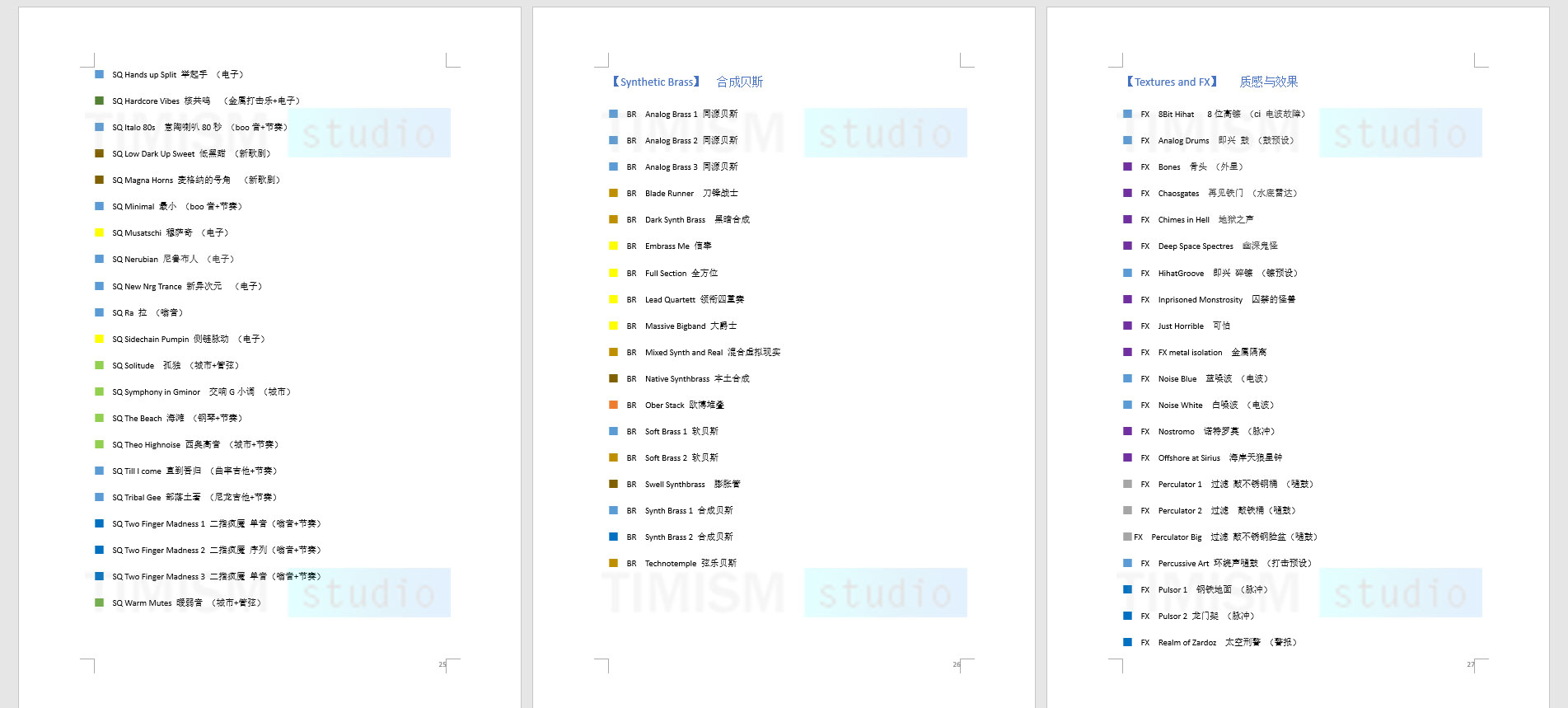 百来套的预置音色想要找到合适的非常麻烦,甚至要去一个个试,所以笔者(一个做设计的?)根据自己的理解制作了一份“音色可视化”列表,方便理解和调用。